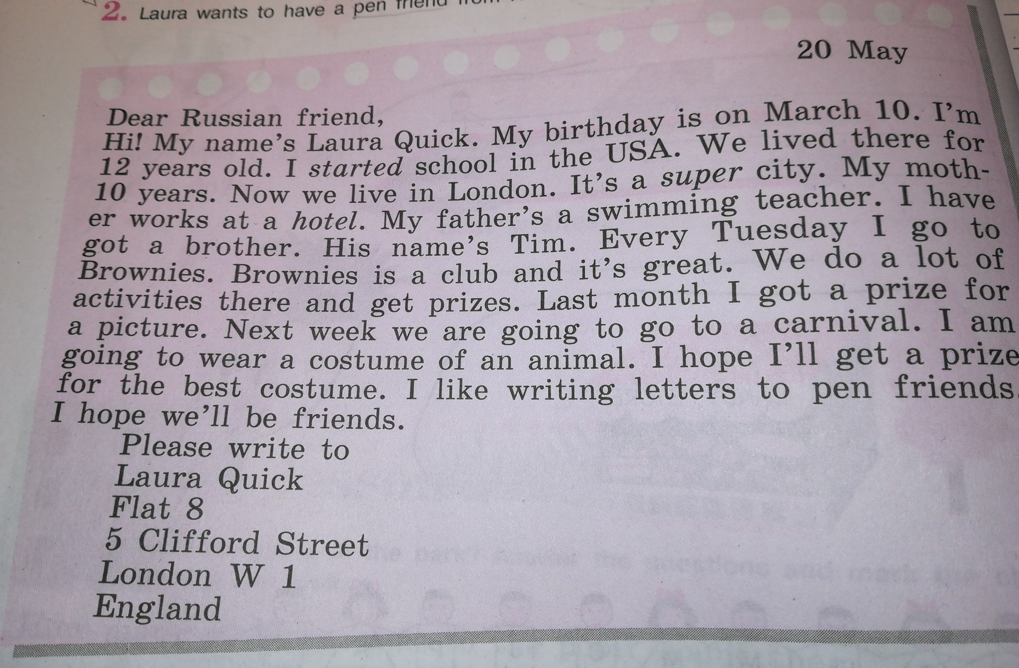 Привет!Мое имя Лаура Куик.Мое день рождение 10 марта.Мне 12 летЯ начала школу в США.Мы жили здесь 10 лет.Сейчас мы живём в Лондоне.Этот город просто супер.Моя мама работает в отеле,мой отец учитель по плаванию.У меня есть брат.Его имя Тим.Каждый вторник я иду в Браунис.Браунис-кружок(секции) и это здорово.Там у нас есть множество занятий,где мы получаем призы.В последнем месяце я получила приз за картинку.На следующей неделе,мы отправляемся на карнавал.Я одену костюм животного.Надеюсь я получу приз за "лучший костюм".Я люблю писать ручкой своим друзьям.