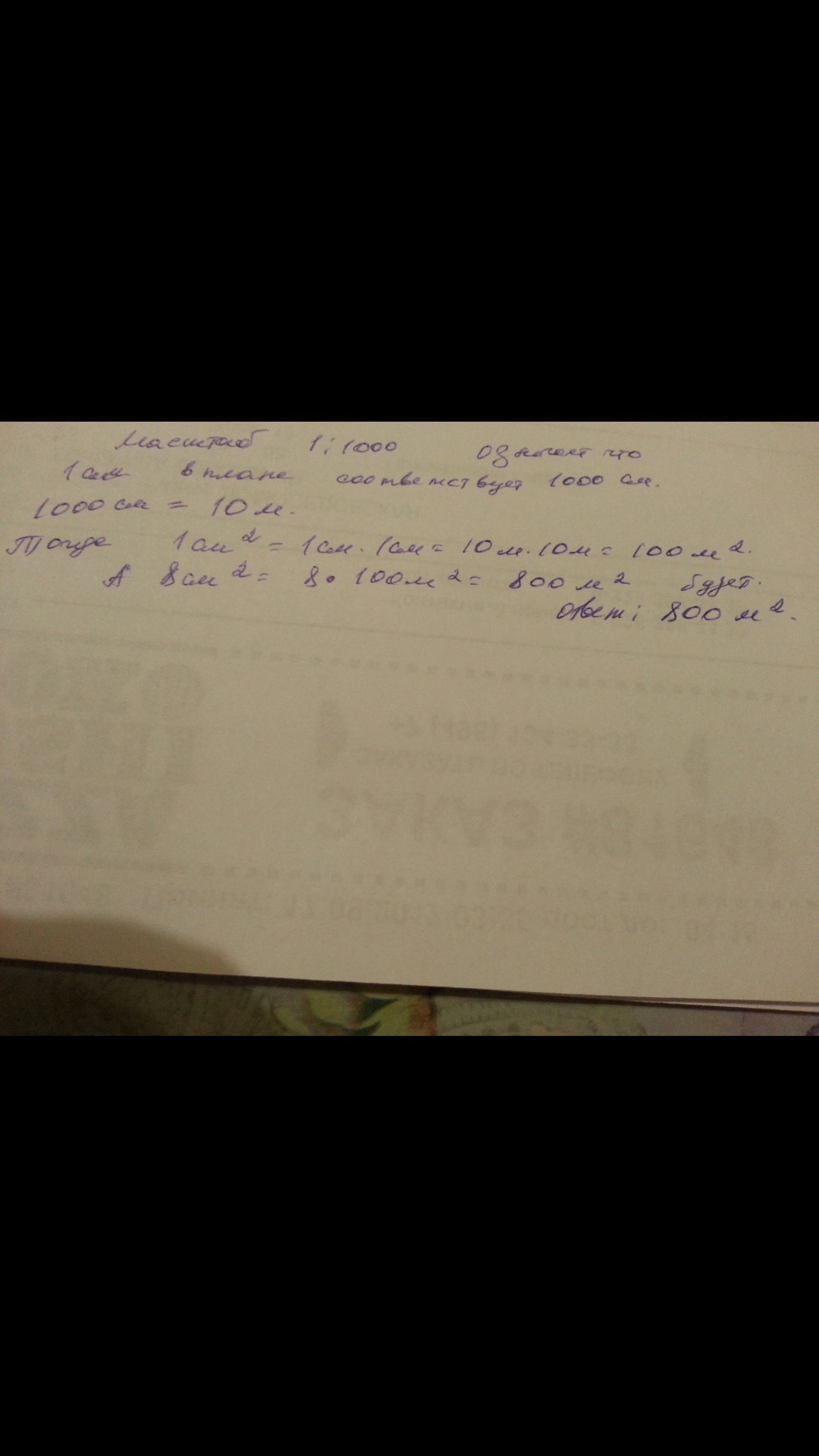 Участок изображен на плане в виде прямоугольника площадью 8см2. Определите площадь земельного участка , если масштаб плана 1:1000.