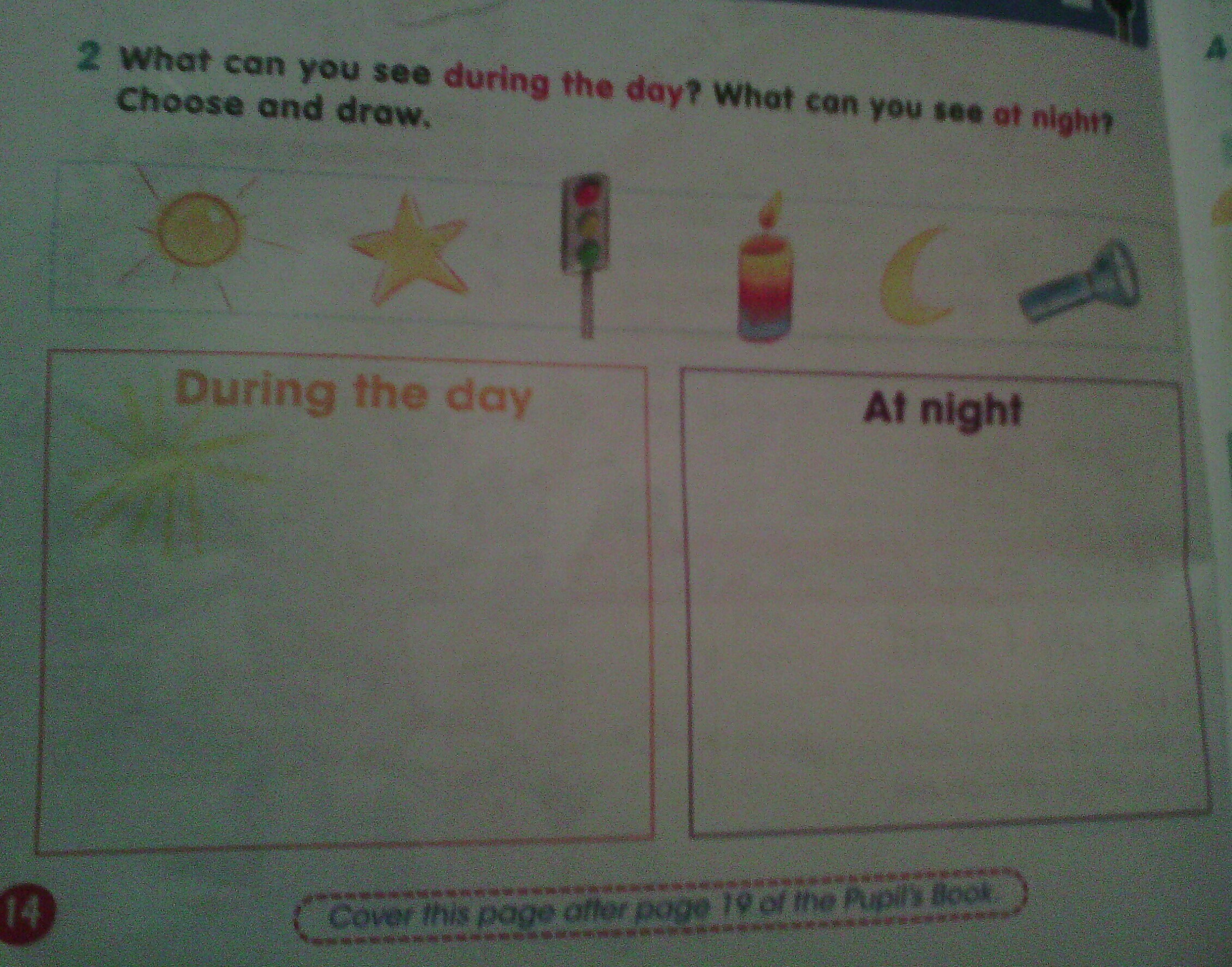 What you see during day? What can you see at night? Choose and draw- (ПЕРЕВОД) - Что вы видите в течение дня? Что вы видите ночью? Выберите и нарисуйте.