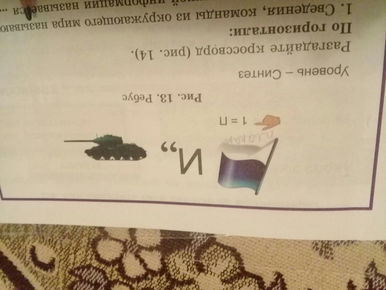 У слова ФЛАГ заменим 1-ю букву на П, получим ПЛАГ , потом И, потом перевёрнутый танк , значит это слово надо читать наоборот : КНАТ- впереди стоят две запятые , значит, убираем две первые буквы, получим АТ
