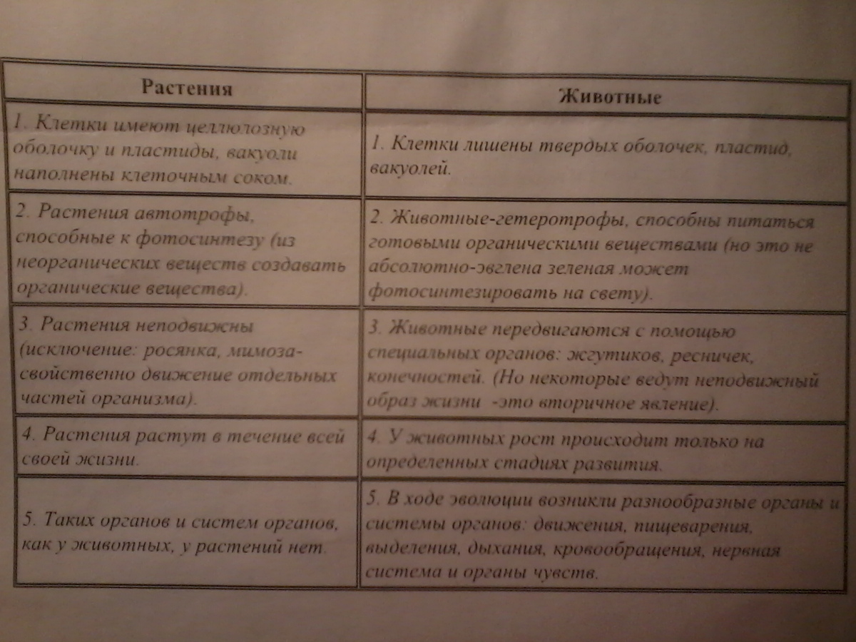В этой таблице сравнительная характеристика растений и животных в том числе и их клеток