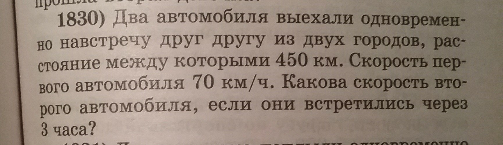 х- скорость второго автомобиля . Согласно условию задачи имеем : (70 + х) *3 = 450 70 + х = 150 ; х = 150 - 70 4 х = 80 км/ч - скорость второго автомобиля