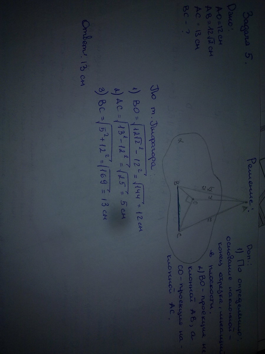 Из точки,отдалённой от плоскости на 12 см,проведены к ней 2 наклонные, длиной 13 см и 12в корни с 2. Угол между проекциями этих наклонных на плоскость равен 90 градусов. Вызначите расстояние между основаниями наклонных.