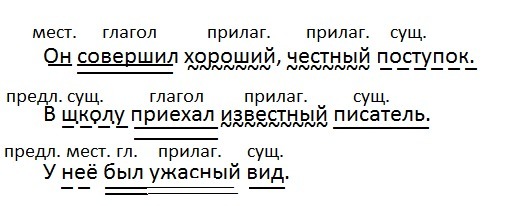 В(предлог)школу(обстоятельство точка тире)приехал(сказуемое,2 чертами)известный(определение волнистой)писатель (подлежащее,1 чертой)
