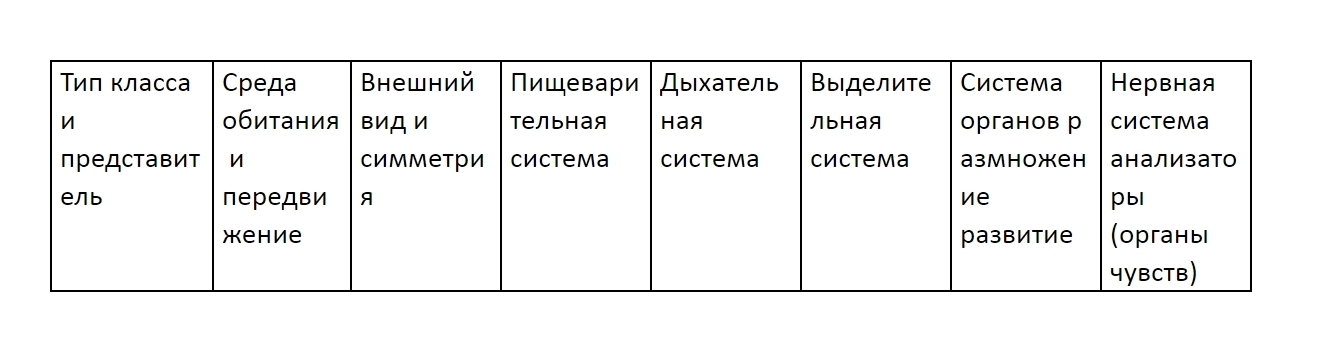 Помогите с таблицей по биологии название таблицы: характика основных типов животных что-бы было 8 сталбцов а не 5 -6