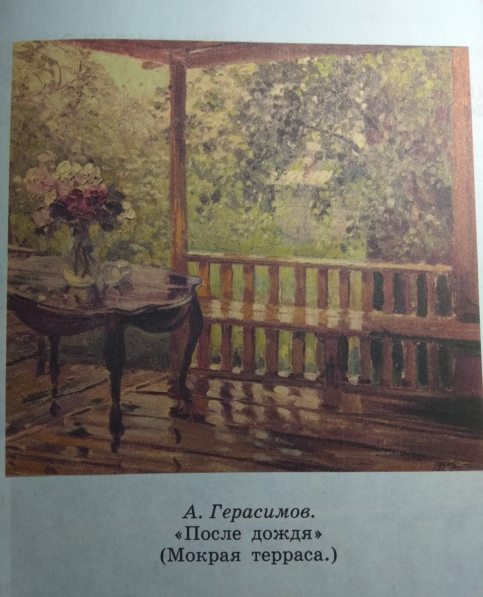 помогите пожалуйста!!!! срочно написать сочинение по картине А. Герасимова "после дождя"(Мокрая терраса.)