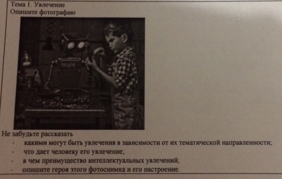 Увлечения могут быть не только с помощью интереса но и с помощью таланта и рвения, увлечения могут быть разными соответствующими таланту или интересу человека, он сам должен выбрать сферу своих увлечений. Увлечение интерес даёт человеку чувство продвижения, он становится более активным, трудолюбивым. Преимущество интеллектуальных увлечений это пополнение знаний, слов, терминов, это улучшает мышление и способность ореинтироваться. На самой фотографии изображён мальчик увлекающийся, видимо техникой. роботами и машинами, он что то чинит или завинчивает. но видно что ему довольно интересно, что можно сказать по его лицу? Мальчик сильно сосредоточен и беспокоен, видно что ему не всё равно...