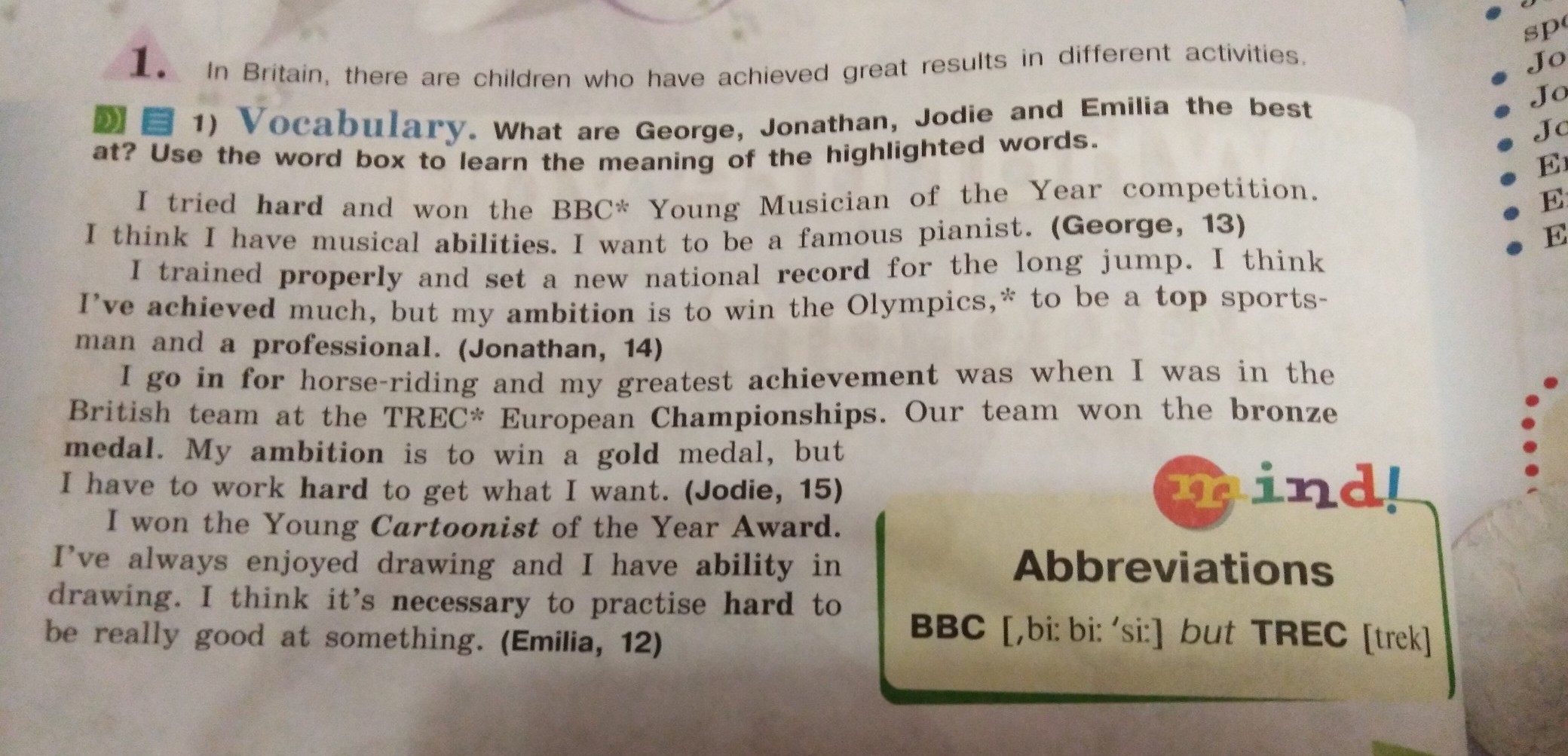 3) Я занимаюсь верховой ездой и мое главное достижение было когда я была в Британской команде на Европейском Чемпионате ТРЭК.Наша команда выиграла бронзовую медаль.Моей амбицией является выигрыш золотой медали, но мне придется сильно трудится чтобы заполучить то что я хочу. (Джоди, 15 лет)