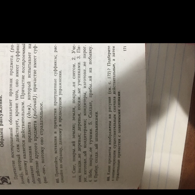 1)Снег, покрывший землю; земля покрытая снегом.2) Ученики , посадившие деревья; деревья посаженные учениками.3) Пирог , изготовленный кондитерами; кондитеры изготовившие пирог.4) Небо, покрытое тучами. 5) Солдат, прибывший на побывку.6) Прибор, созданный школьниками.