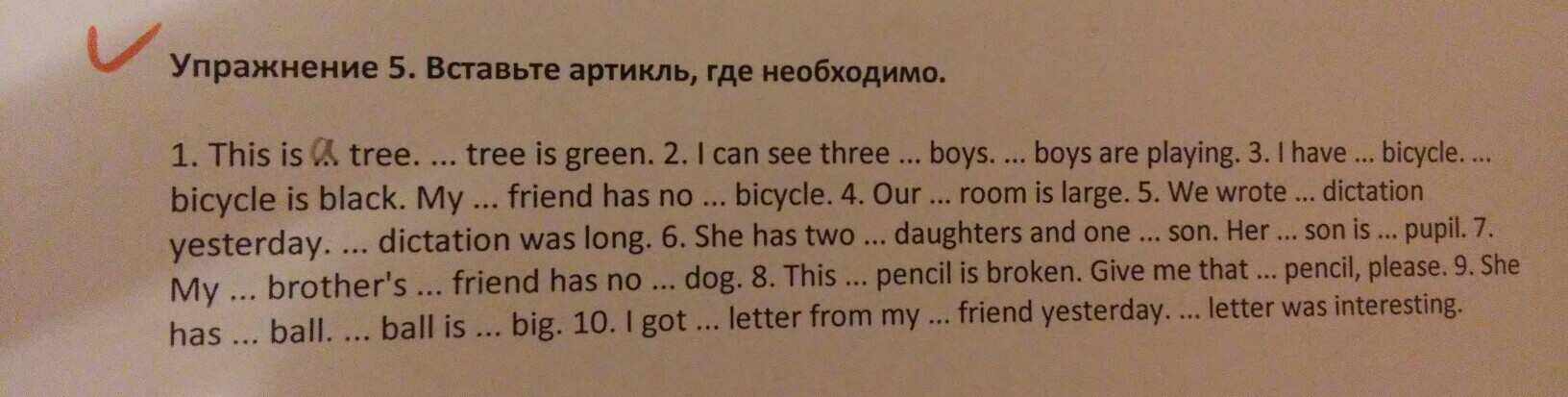 1) This is a tree. The tree is green. 2) I can see three boys. The boys are playing. 3) I have a bicycle. The bicycle is black. My friend has no bicycle. 4) Our room is large. 5) We wrote a dictation yesterday. The dictation was long. 6) She has two daughters and one son. Her son is a pupil. 7) My brother`s friend has no dog. 8) This pencil is broken. Give me that pencil, please. 9) She has a ball. The ball is big. 10) I got a letter from my friend yesterday. The letter was interesting.