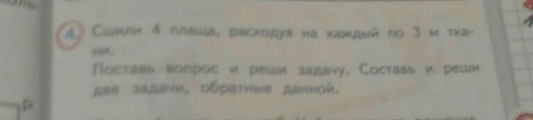 Сшили 4 плаша расходуя на каждый по 3 м ткани.Поставь вопрос и реши задачу.составь и реши две задачи обратной данной.
