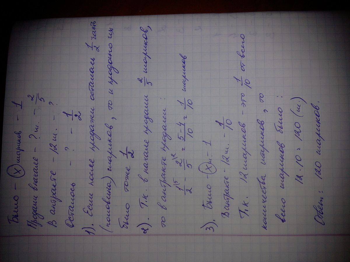 Перед представлением в цирк для продажи было заготовлено некоторое количество шариков. Перед началом представления было продано 2/5 всех воздушных шариков, а в антракте-ещё 12 штук. После этого осталась половина всех шариков. Сколько шариков было первоначально?
