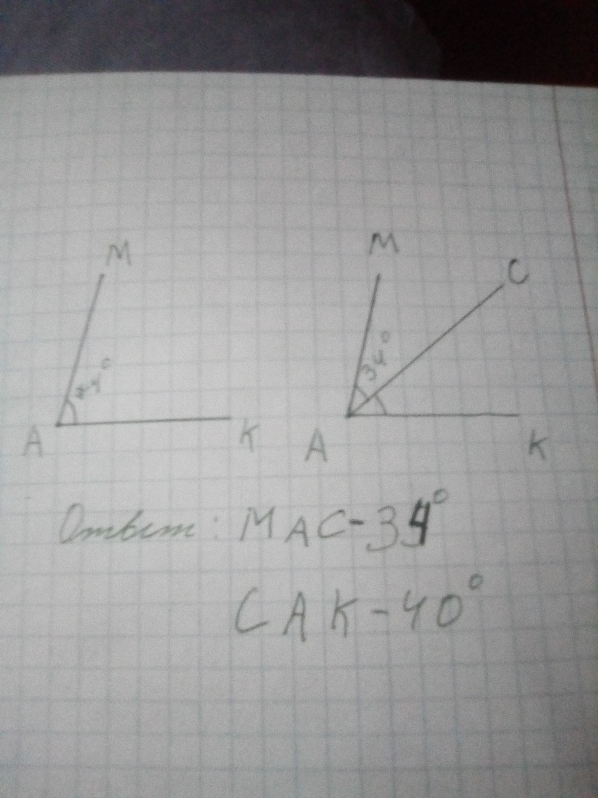 Постройте угол MKA в 74 градуса проведите биссектрису и запишите образовавшиеся углы и вычислите их величины. Заранее спасибо