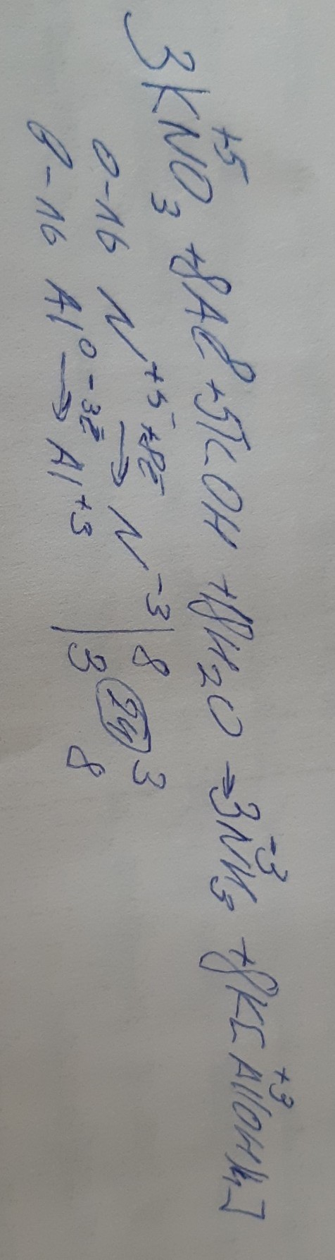 Расставьте коэффициенты с помощью метода электронного баланса KNO3+Al+KOH+H2O=NH3+K[Al(OH)4]