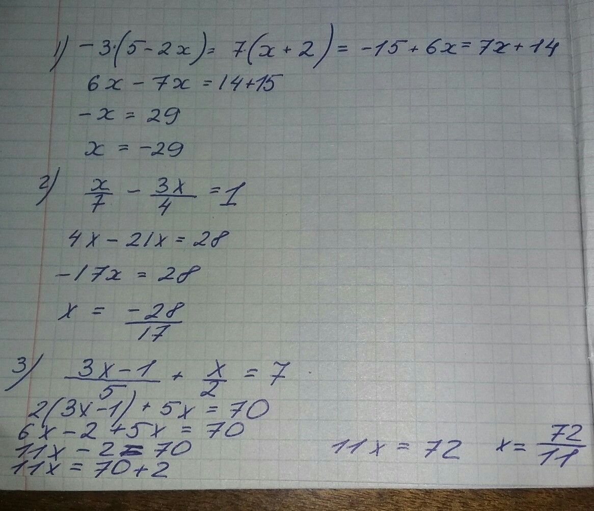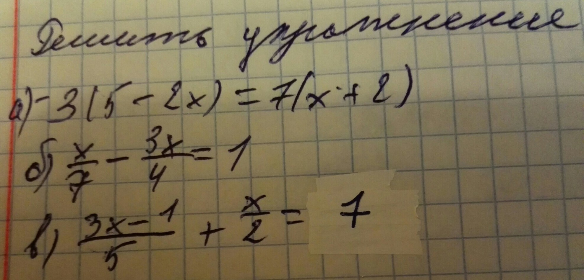 в)(3x-1)/5+x/2=7 (приводим к общему знаменателю в виде 10)