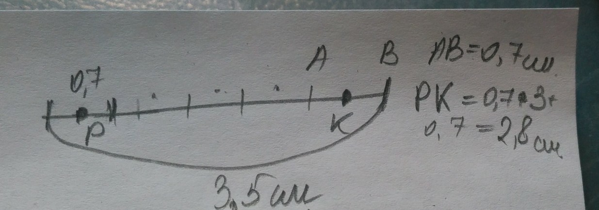 Решение на фото. Каждый маленький отрезок = 0,7 см, таких целых влезает три. И ещё два по половине, в сумме они тоже дают 0,7 см. Итого: