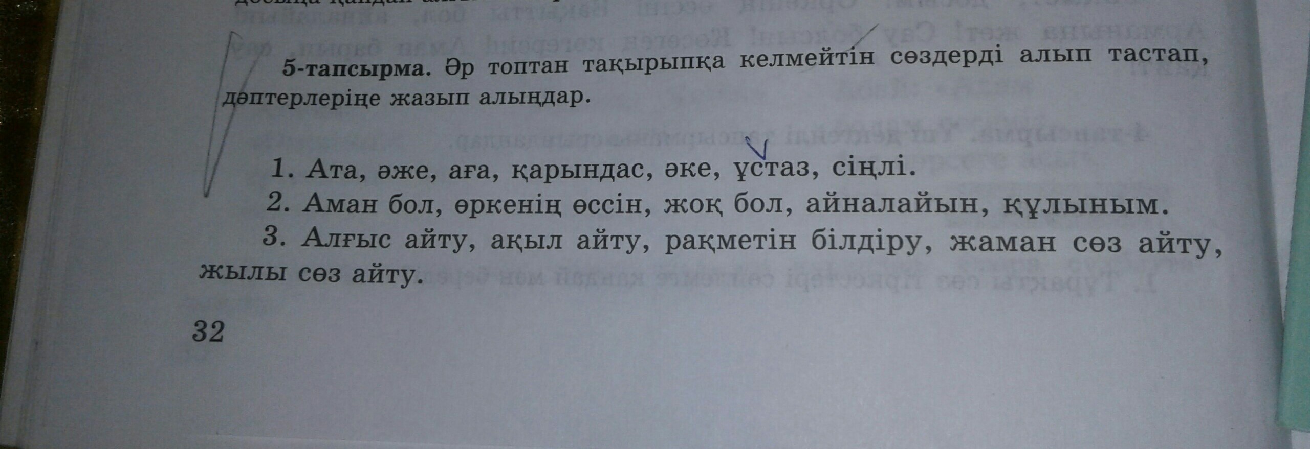 əр топтан тақырыпқа келмейтін сөздерді алып тастап, дəптерлеріне жазып алыңдар 2 ) аман бол; өлкенің өссін ;жоқ бол ; айналайын ;құлыным 3) алғыс айту ; ақыл айту ;рақметін білдіру ; жаман сөз ;айту жылы сөз айту