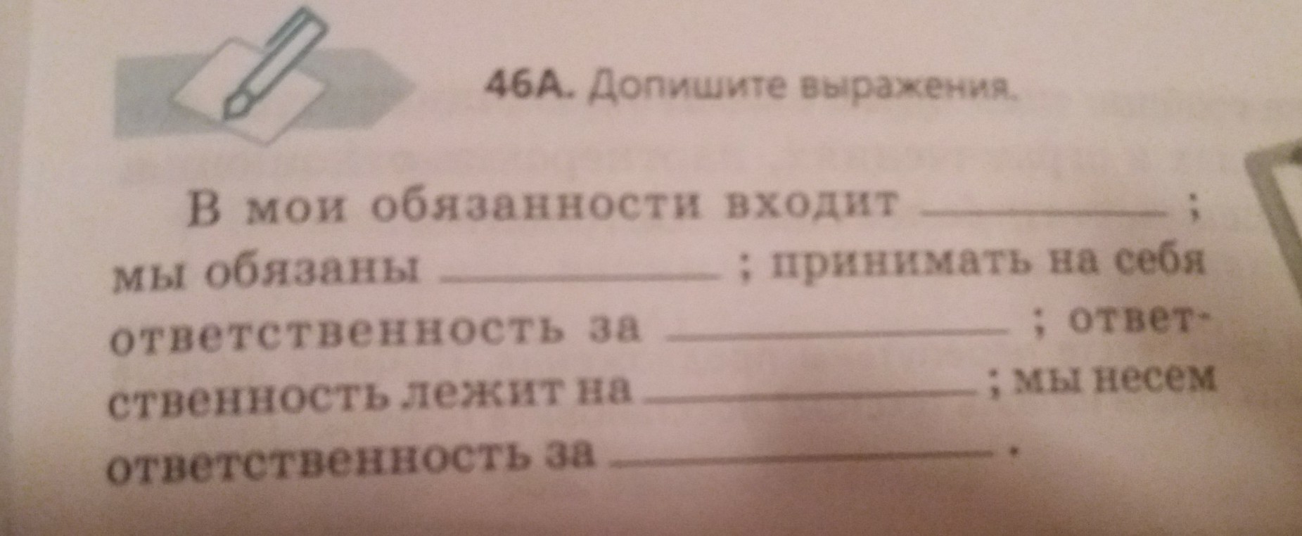 В мои обязанности входит ходить в школу;мы обязаны защищать Отечество;принимать на себя ответственность за свои поступки;ответственность лежит на нас;мы несём ответственность за свою жизнь.