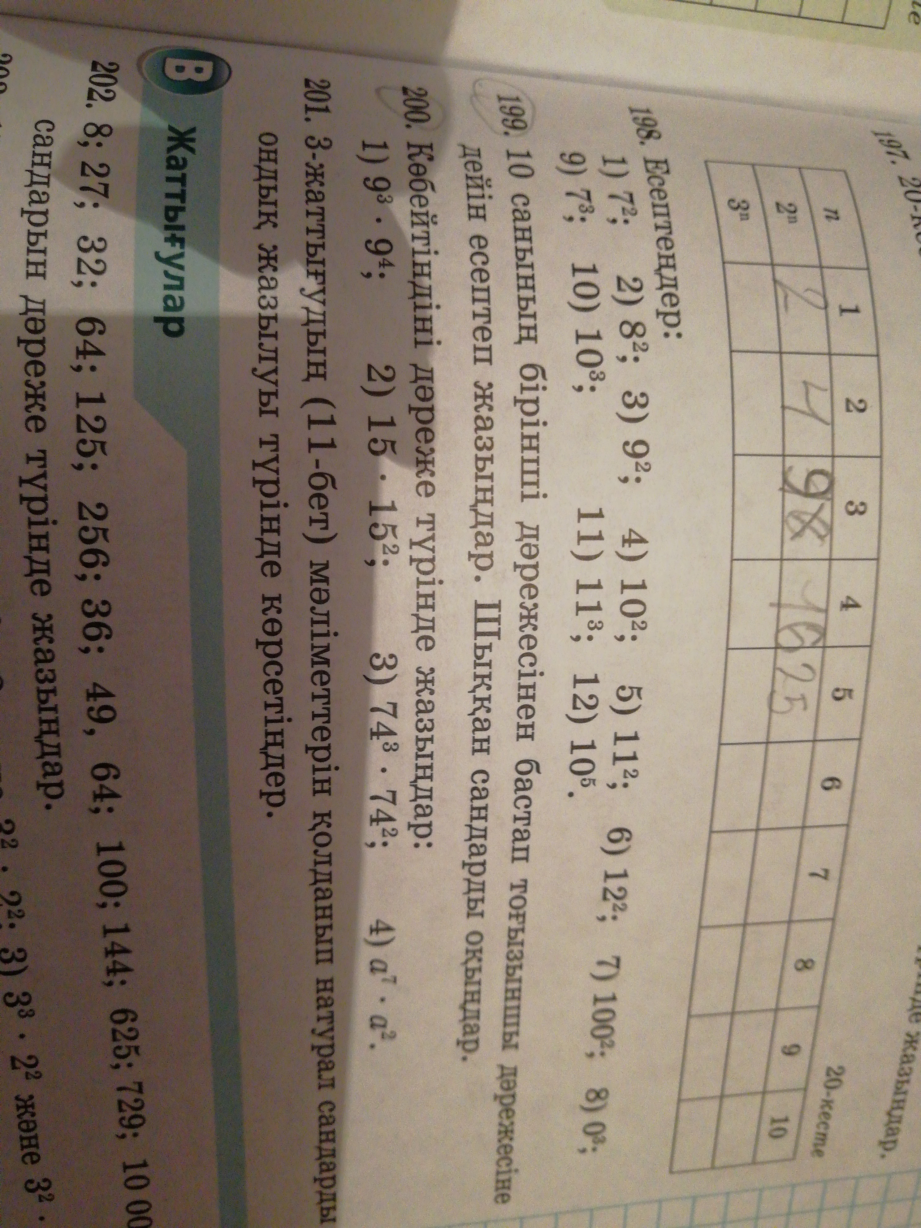 199 есеп 65 бет 5 сынып 10 санының бірінші дәрежесінен бастап тоғызыншы дәрежесіне дейін есептен жазыңдар. Шыққан сандарды оқыңдар