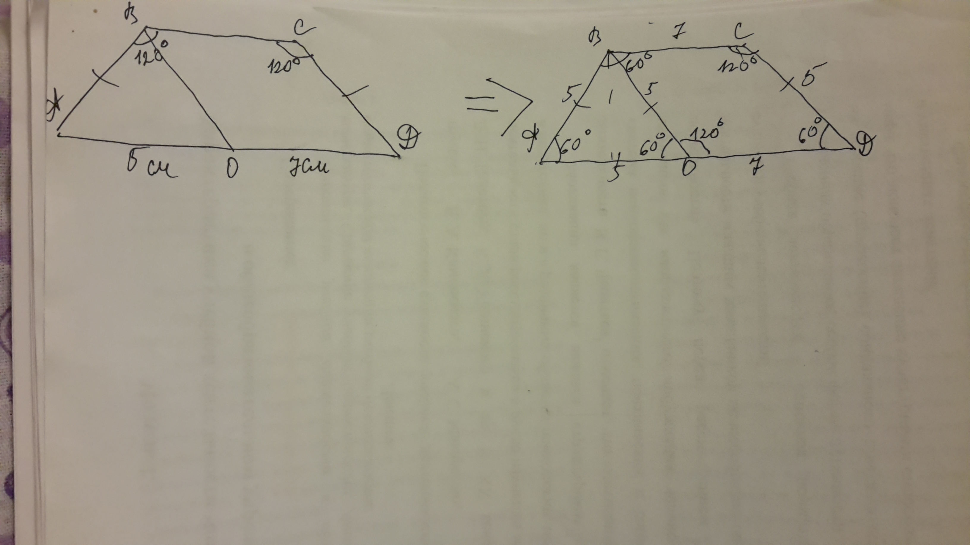 угол при основании равнобокой трапеции равен 120 градусов. Прямая которая проходит через вершину тупого угла и параллельна боковой стороне делит большее основание на отрезки 5см и 7см. надо найти периметр трапеции