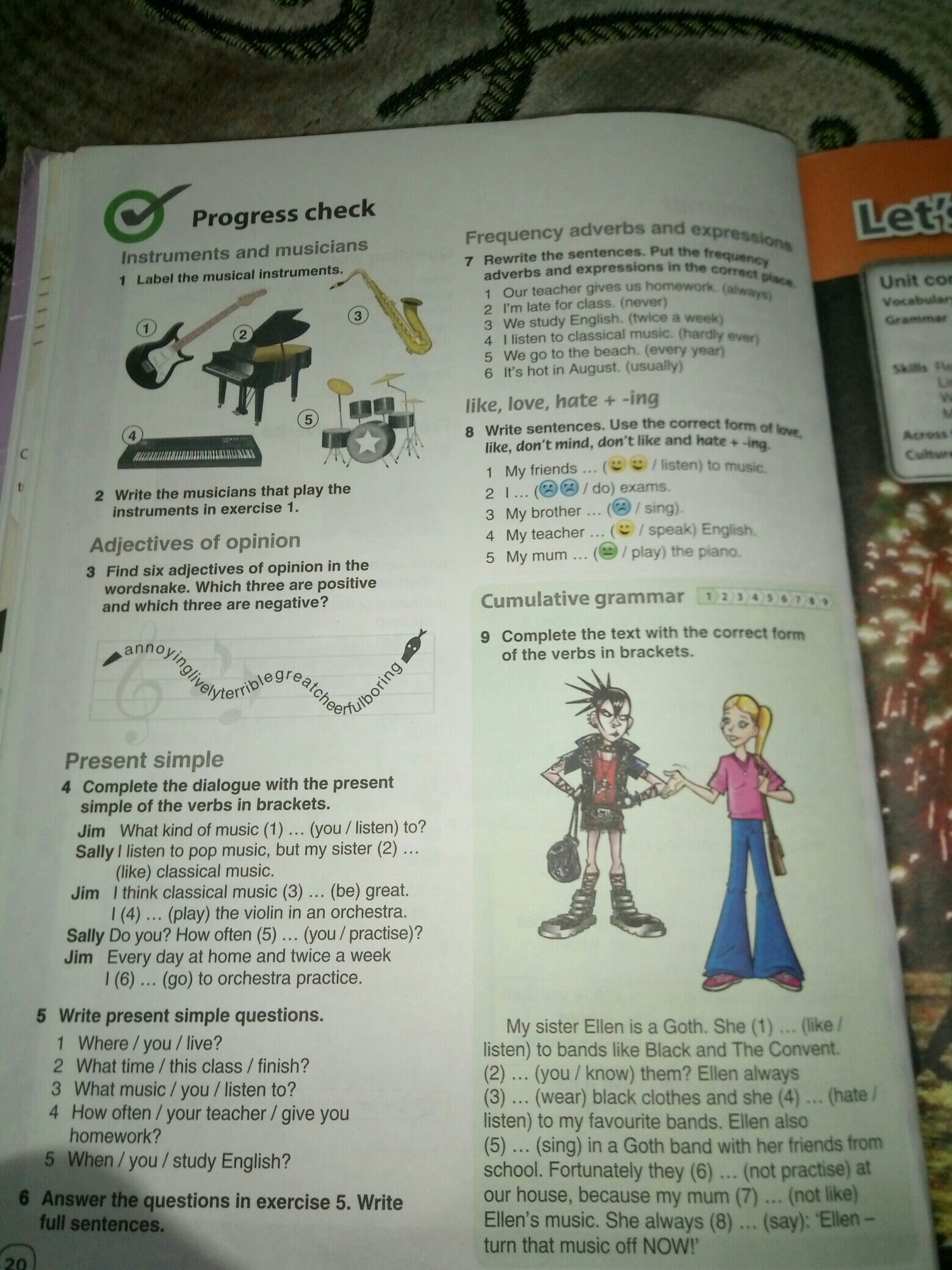 8. 1-My friends likes listening to music. 2-I hate doing exam. 3-My brother don't liking sing. 4-My teacher hate speaking English. 5-My mom don't like playing the piano.