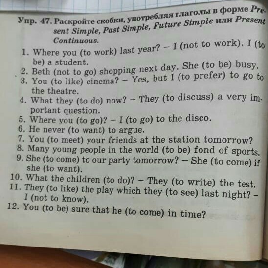 1. Where did you work last year? - I didn't work. I was a student. 2. Beth won't go shopping next day. She'll be busy. 3. Do you like cinema? - Yes, but I prefer to go to the theatre. 4. What are they doing now? - They're discussing a very important question. 5. Where are you going? - I'm going to the disco. 6. He never wants to argue. 7. Will you meet your friends at the station tomorrow? 8. Many young people in the world are fond of sports. 9. Will she come to our party tomorrow? - She will come if she wants. 10. What are the children doing? - They're writing the test. 11. Did they like the play which they saw last night? - I don't know. 12. Are you sure that he will come in time?