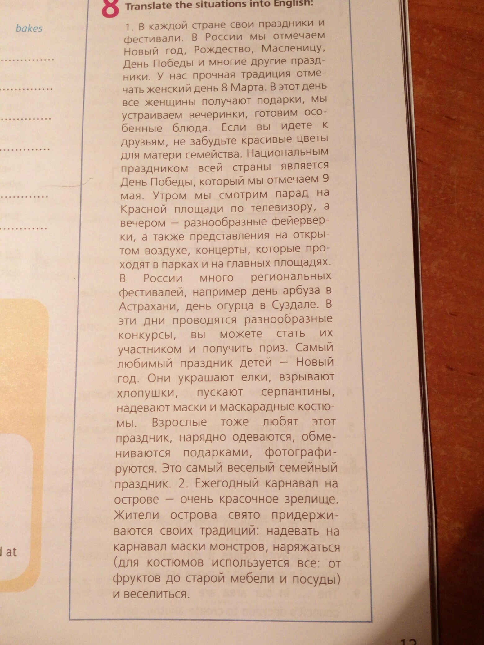 1. In every country there are their own holidays and festivals. In Russia we celebrates yhe New Year, the Maslenitsa, the Day of Victory and many other holidays. We have a strong tradition to celebte the Women's Day 8 March. All women receives gifts 8n the Day, we have parties, cook special dishes.