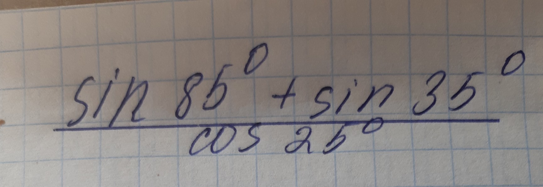 sin 85(градусов)+sin 35(градусов)=2 sin(85+35/2)*cos(85-35/2)=2sin60(градусов)cos25(градусов). 2 sin60(градусов)*cos25(градусов) / cos 25(градусов)=2* sin60(градусов). получаем: 2*(корень из 3/2)=корень из 3. sin 85(градусов)+sin 35(градусов) используем формулу: sina+sinb=2*sin(a+b/2)*cos(a-b/2).