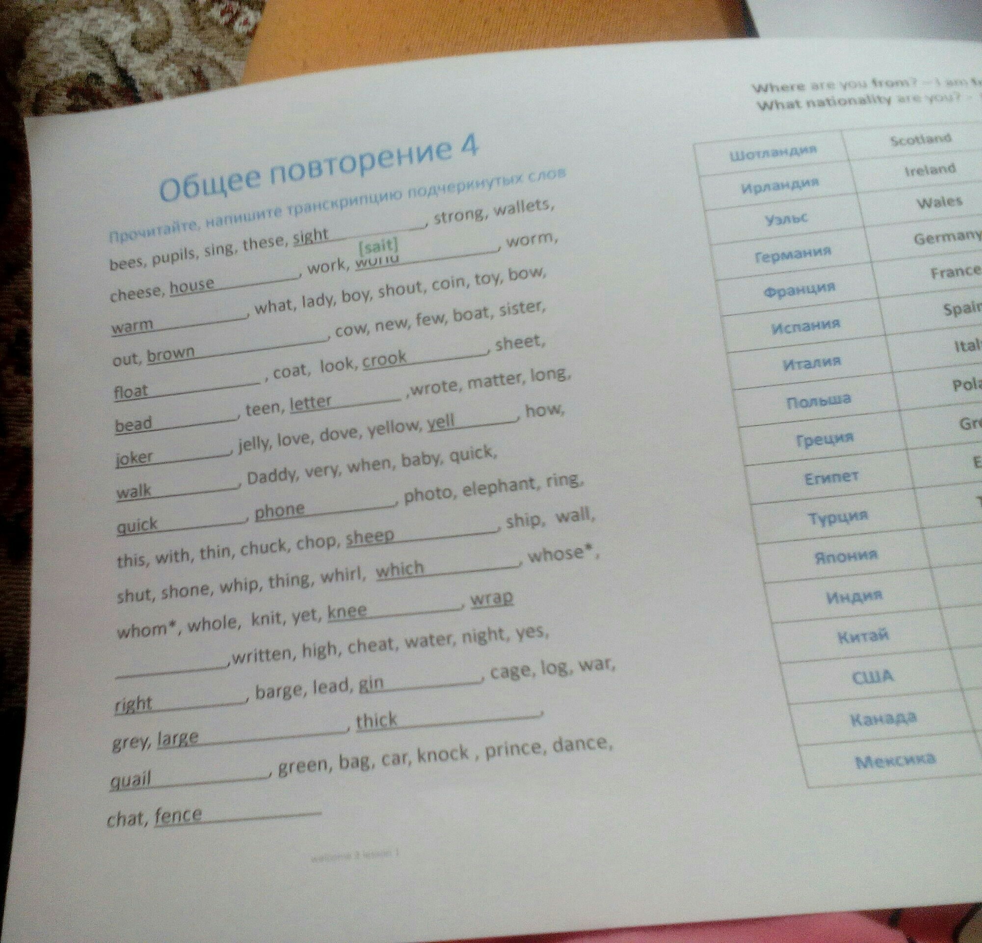 Найди в интернете словарь англо-русский, там найдёшь эти слова и посмотришь транскрипцию и перевод, если нужен.