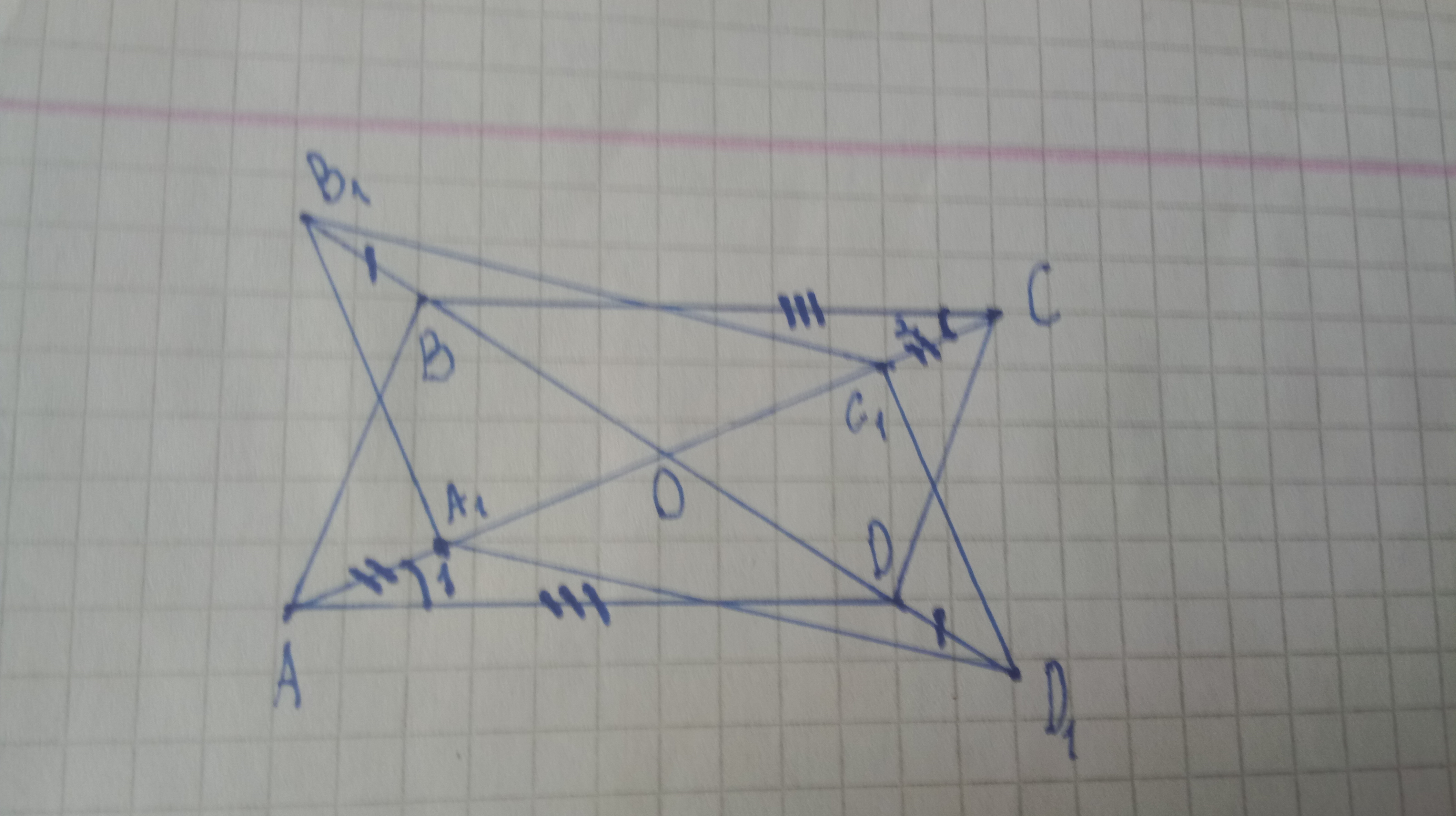не очень удачный рисунок дальше нужно доказать что B1OA1=D1OA1 (например что если сторона и 2 угла между ним 1 треугольника раны 2 углам 2 то такие треугольники раны или как то так )