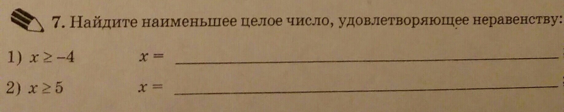 Ну смотри. Значок, который показывает "больше с палочкой" означает, что число может быть, либо больше, либо меньше. Наименьшее целое число (целое, то есть не десятичное или дробное, например: 1 или 2). В 1-ом ответ -4, т.к. x может быть равен -4 (по значку "больше с палочкой", говорят x больше или равно -4). Аналогично со 2-ым пунктом. Наименьшее равно 5. Будут вопросы, спрашивай ниже.