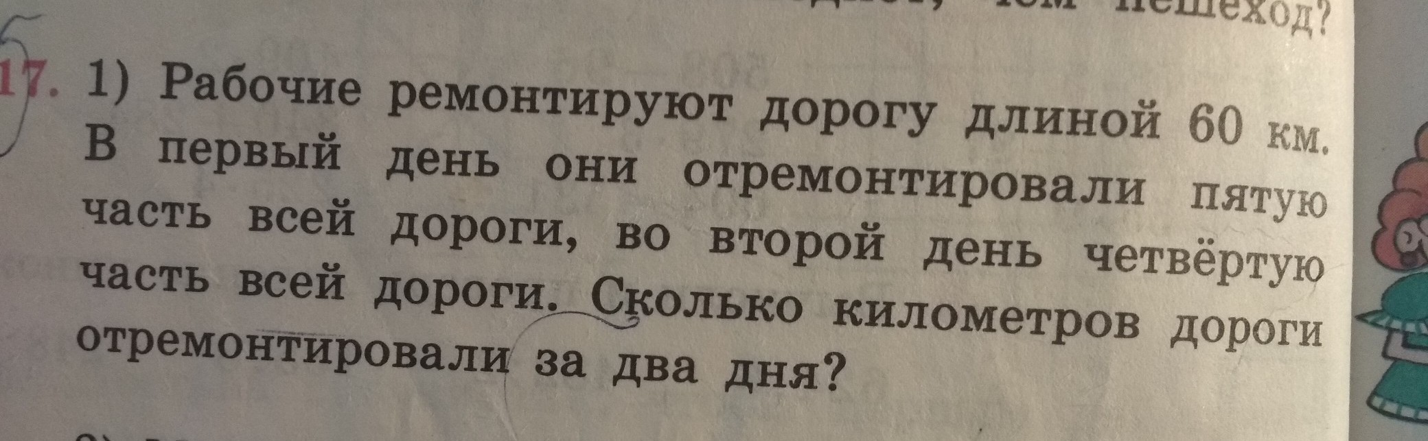 1)60:5=12(км) рабочие отремонтировали в первый день.