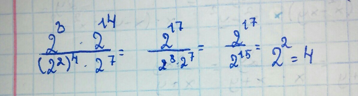 2^3*2^14 / 2^8*2^7=2^17 / 2^15=2^2=4. ^-это степень.