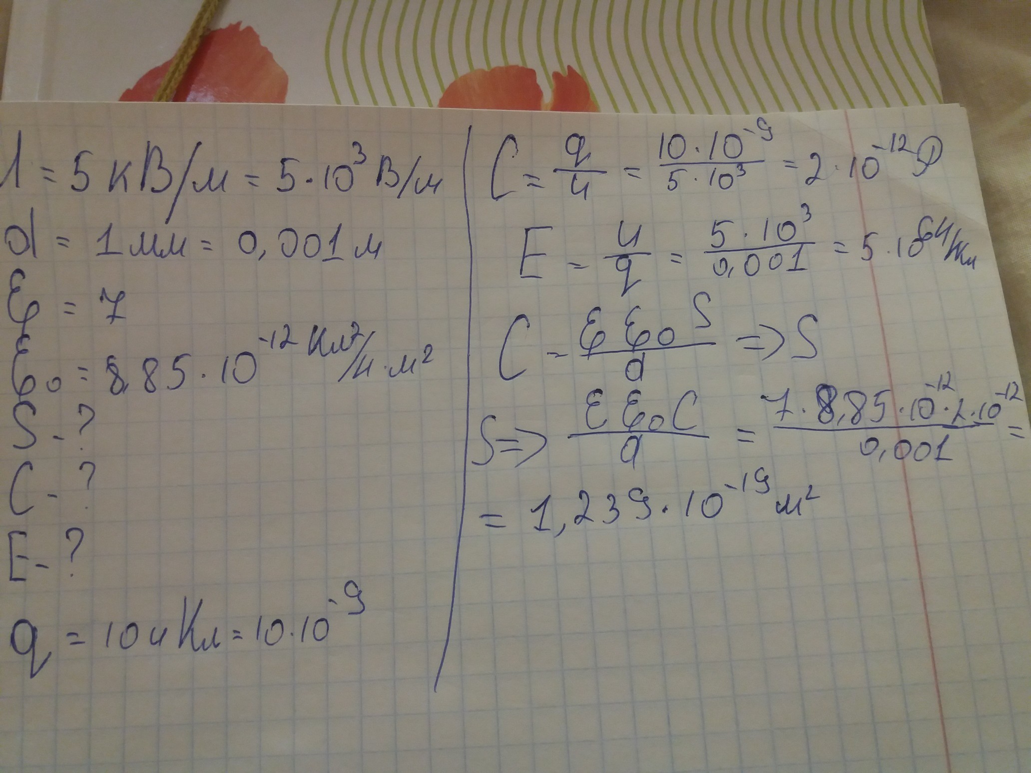 модуль напруженості електричного поля між пластинами конденсатора дорівнює 5 кВ/м, відстань між пдастинами 1мм, заряд конденсатора 10нКл. Знайдіть ємність даного конденсатора та визначте енергію й площу пластини даного конденсатора, якщо між пластинами слюда (є=7)