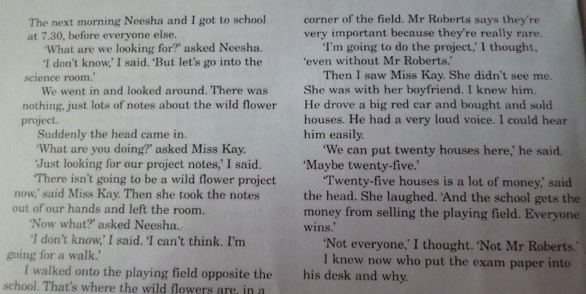 Следующи утром мы проснулись в 7 30.Что мы ищем? спросил Neesha.Я не знаю ответил я,но пойдём посмотрим что там.мы сошли внутрь и оглянулись.там не было ничего только много тетрадок с проектами про дикие цветки.Внезапно кто то зашел в комнату.Что вы делаете? спросила мисс Кай. Ничего. только ищем тетрадку с нашим проектом ответил я.Здесь не может быть вашего проекта сказала она.Она взяла тетрадки с наших рук и покинула комнату. Что теперь? спросил Neesha?Не знаю ответил я.Мне надо прогуляться.Я вышел на игровое поле напротив школы.Здесь было несколько диких цветков.Мисс Корнер говорила что они очень важны потому что они редкие.Я подумал что пойду делать проект без мистра Робертса.Затем я встретил мисс Корнер.Она не видела меня.Она была с бойфрендом.Я знал его.У него была большая красная машина и большой дом.У него был очень громкий голос и я мог слышать его с легкостью.Мы можем построить здесь 20 домов.мо