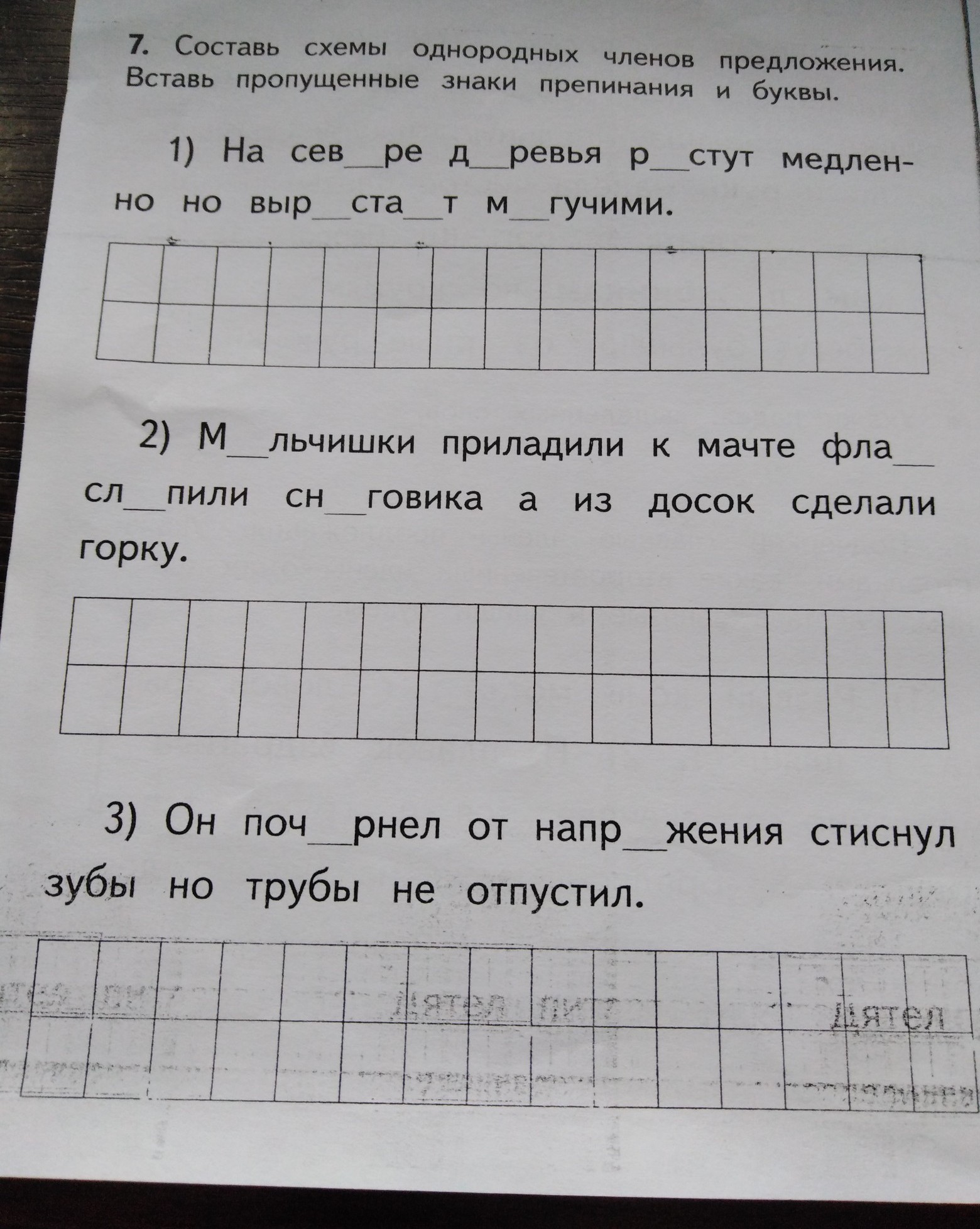 2) Мальчики приладили к мачте флаг, слепили снеговика, а из досок сделали горку. Мальчики: приладили, слепили, сделали (однородные сказуемые);
