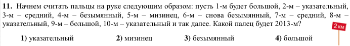 замечаем,что мезинец соответствует числам 5, 13, 21, 29... т.е. от деления числа на 8 в остатке получаем 5 . Проверяем 2013:8=151 ост.5