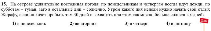 30:7=4 ост.2 т.е. полные 4 недели и 2 дня. Чтобы эти 2 дня были солнечными,отдыхать нужно начинать утром во вторник