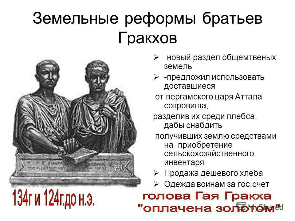 Реформы братьев Гракхов были нацелены на решение этих проблем. Они предусматривали изъятие излишков земли у богатых аристократов с целью передачи армейским ветеранам и крестьянам, вытесненным со своих участков.