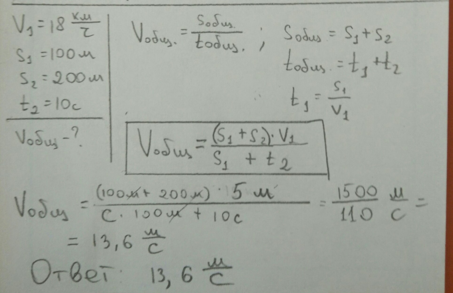 автомобиль первые 100м проехал со скоростью 18 км/ч а следущие 200 м за 10с .Чему равна средняя скорость автомобиля
