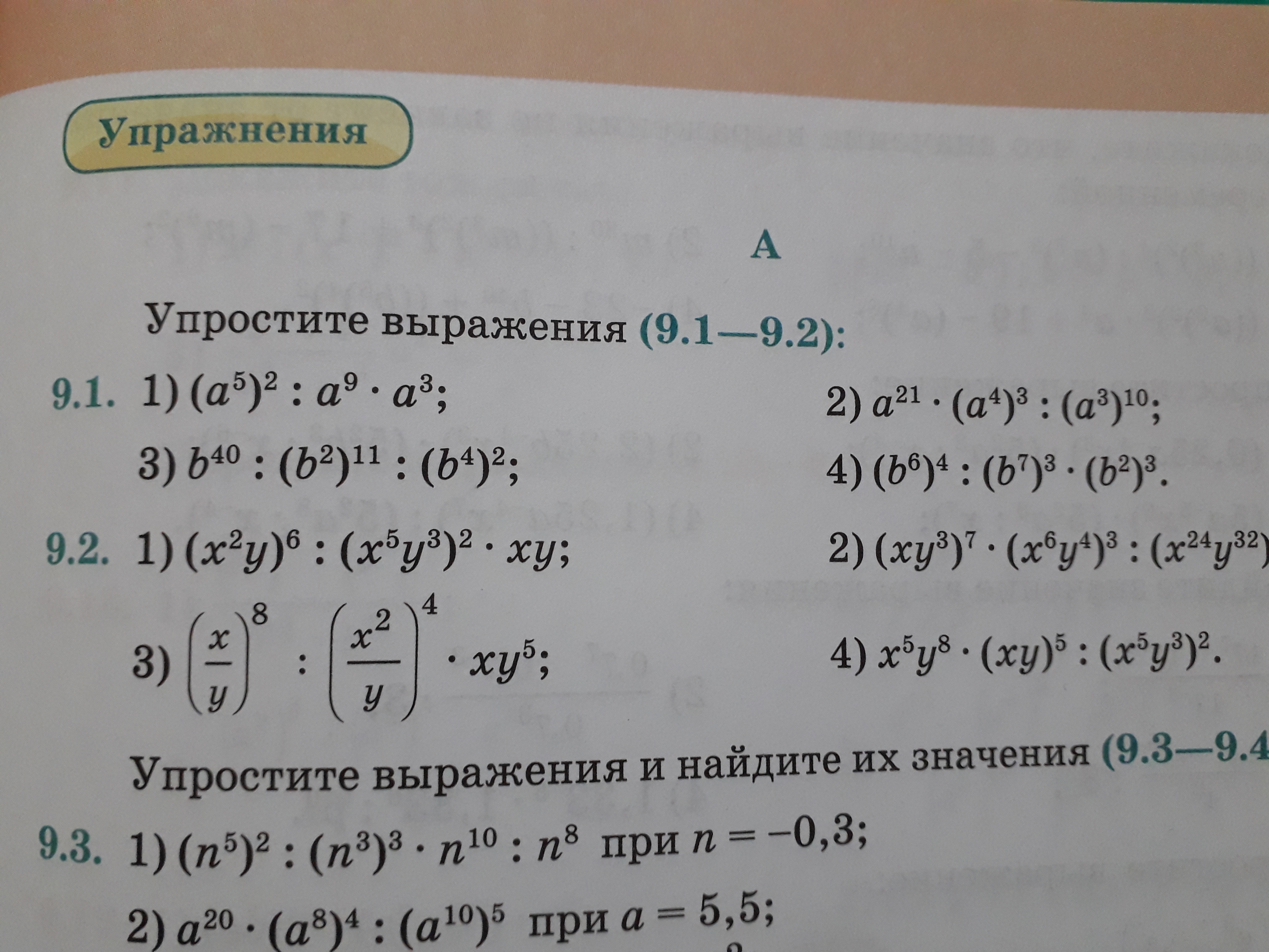 1) а^10:а^9×а^3=а×а^3=а^4