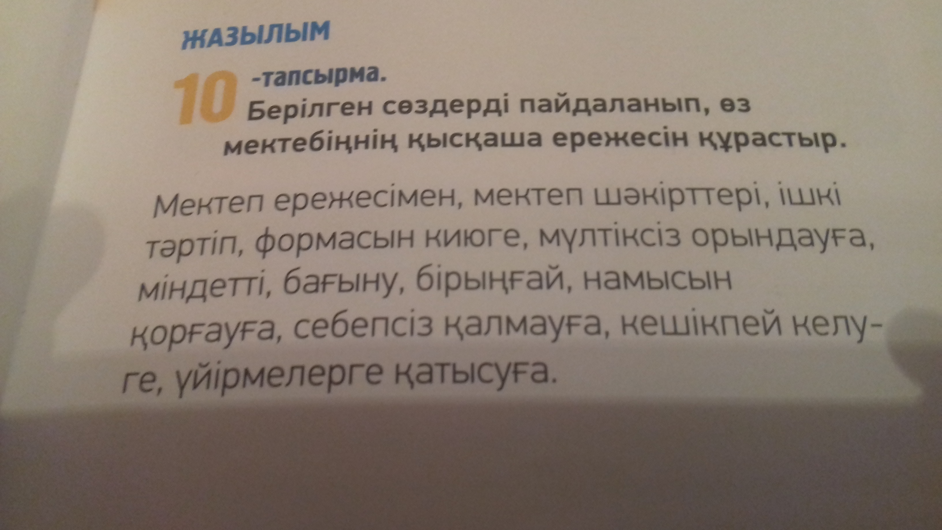 Менің мектебім үлкен. Мектепте форманы киеді. Мектепте балалар әр түрлі үйірмелеге қатысады. Балалар намысын қорғайды. Менің мектепте балалар өте тәртіпті және ақылды