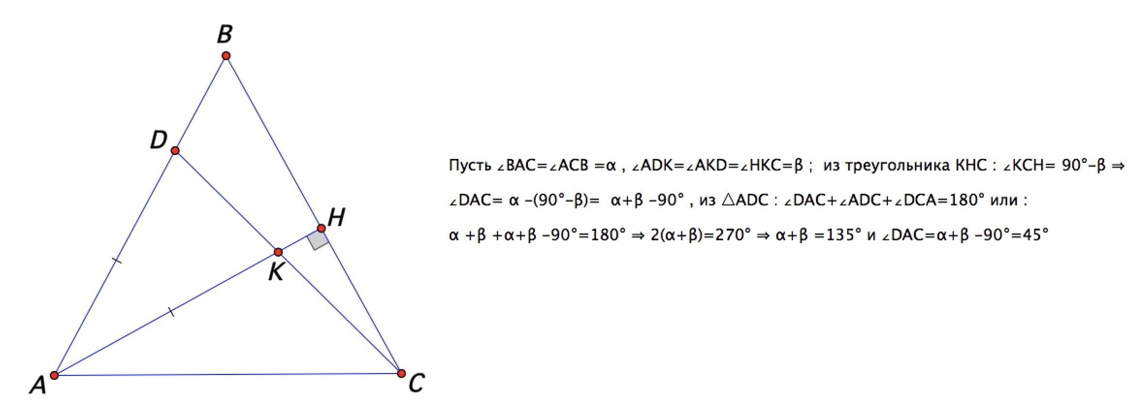 В равнобедренном треугольнике АВС с основанием АС на боковой стороне АВ отмечена точка D. Высота АН трекгольника АВС пересекает отрезок СD в точке К. Оказалось, что АD=АК. Найдите угол DСА