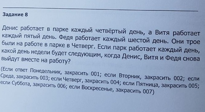 60/7= через 8 недель и 4 дня они снова выйдут на работу вместе.