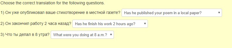 Он уже опубликовал ваше стихотворение в местной газете? [Choose the answer] Did he publish your poem in a local paper?Has he already published your poem in a local paper?Did he already published your poem in a local paper?Has he published your poem in a local paper?Did he publish your poem in a local paper?