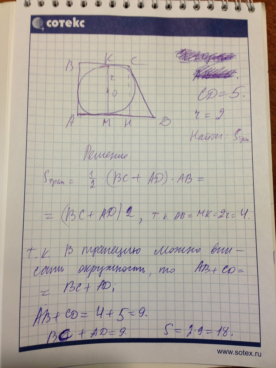 Около круга радиуса 2 описана прямоугольная трапеция,боковая сторона которой 5.Найти площадь трапеции