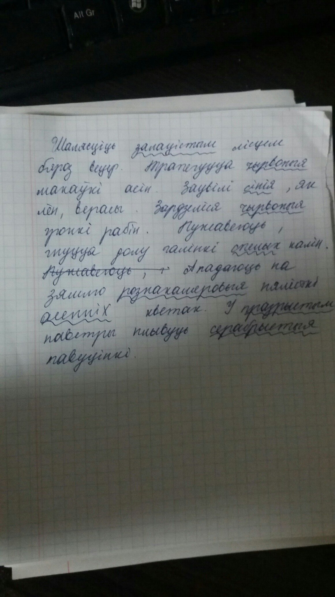 Шалясциць залацистым лисцем бяроз вецер.Трапечуцца чырвоныя макауки асин.Зацвили синия,як лен,верасы.Зардзелися чырвоныя гронки рабин.Пунсавеюць,гнуццадолу галинки спелых калин.Ападаюць на зямлю рознакаляровыя пялестки асенних кветак.У празрыстым паветры плывуць серабрыстыя павуцинки.Падкрэслице прыметники.