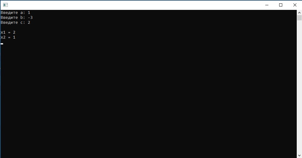 Console.WriteLine("nx1 = " + ((b * -1 + sqrtD) / 2 * a) + "nx2 = " + ((b * -1 - sqrtD) / 2 * a));
