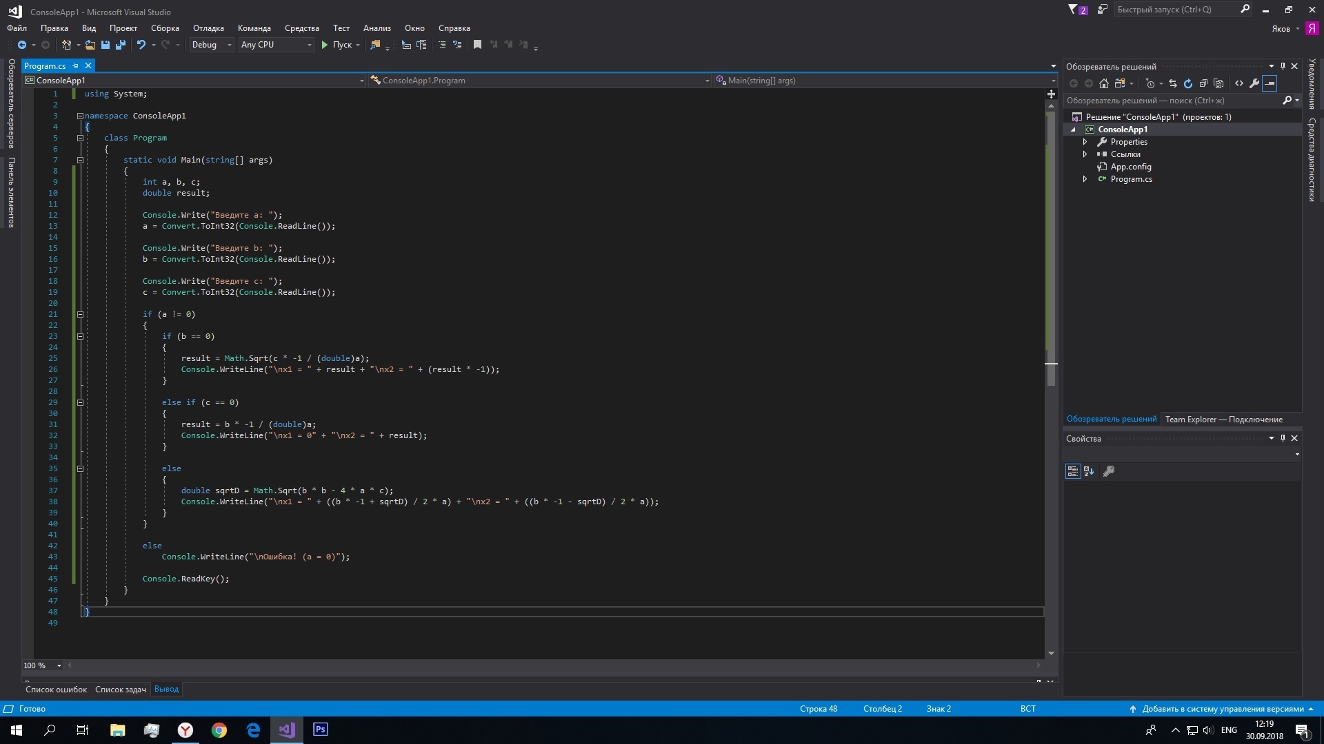 Console.WriteLine("nx1 = " + result + "nx2 = " + (result * -1));