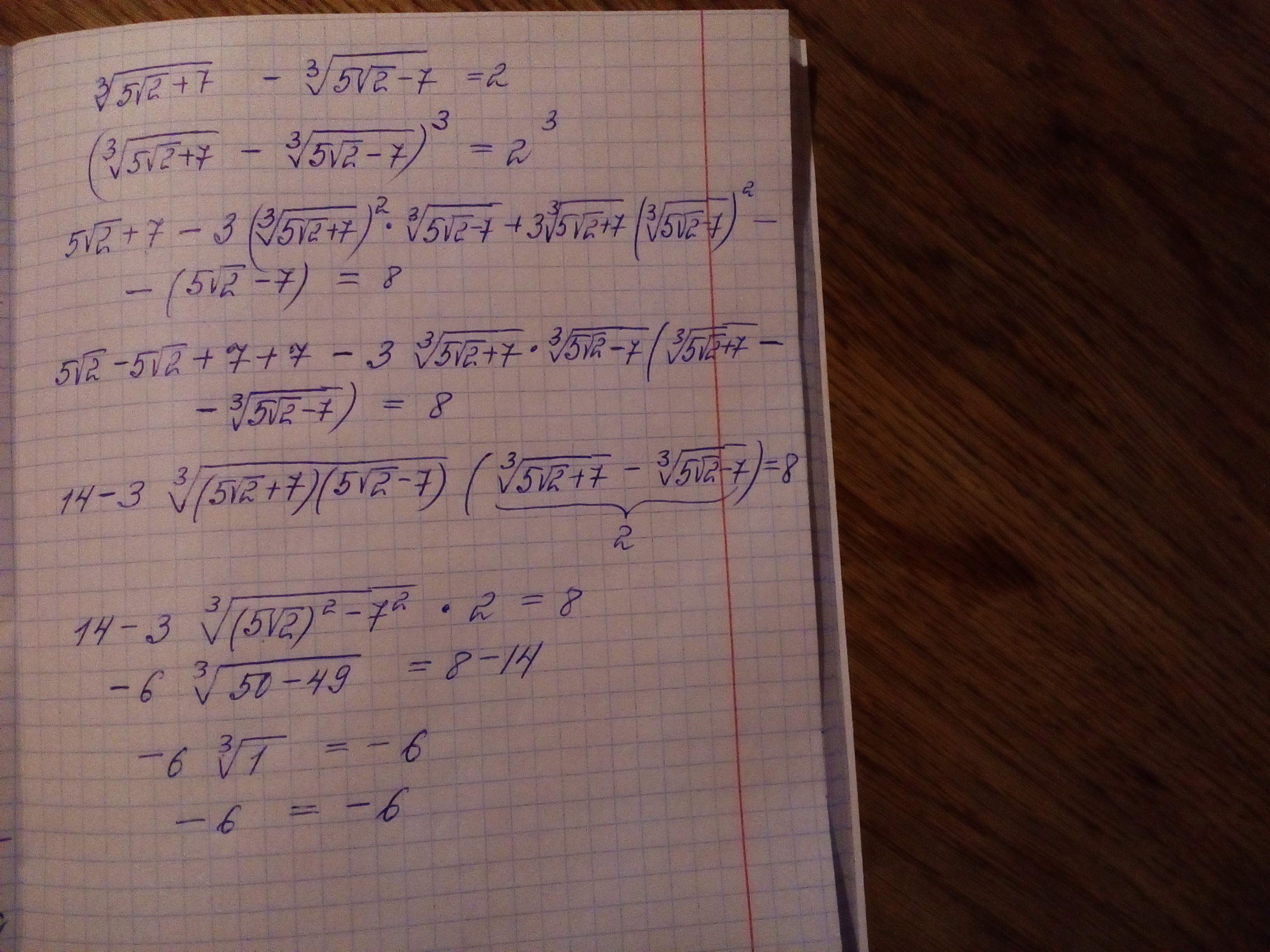 task/29743978 Проверить равенство ∛(5√2 +7) - ∛(5√2 - 7) = 2